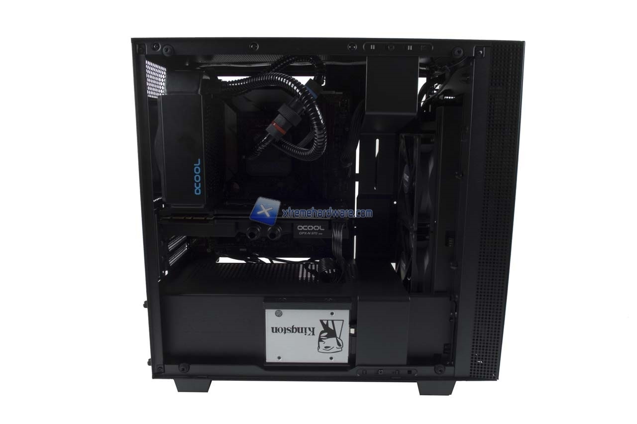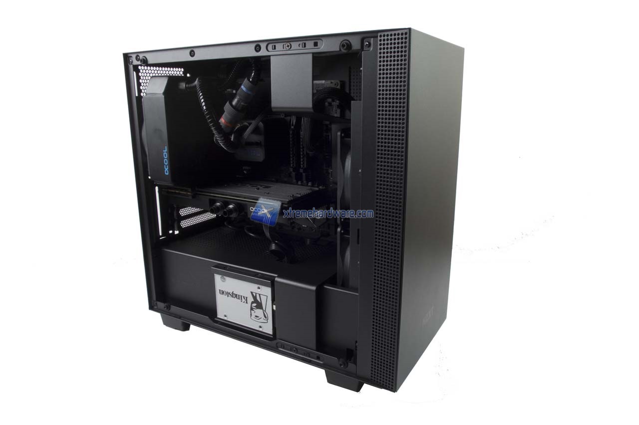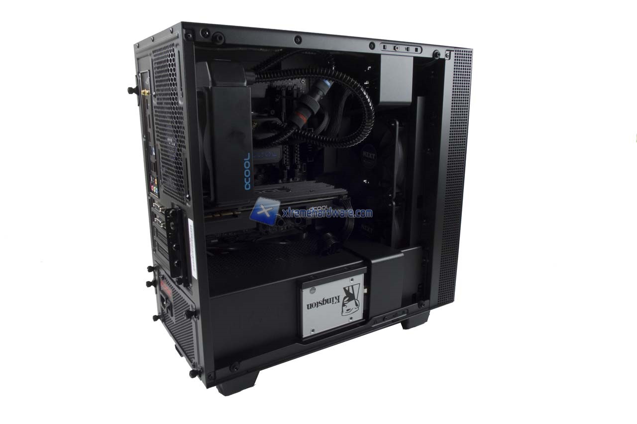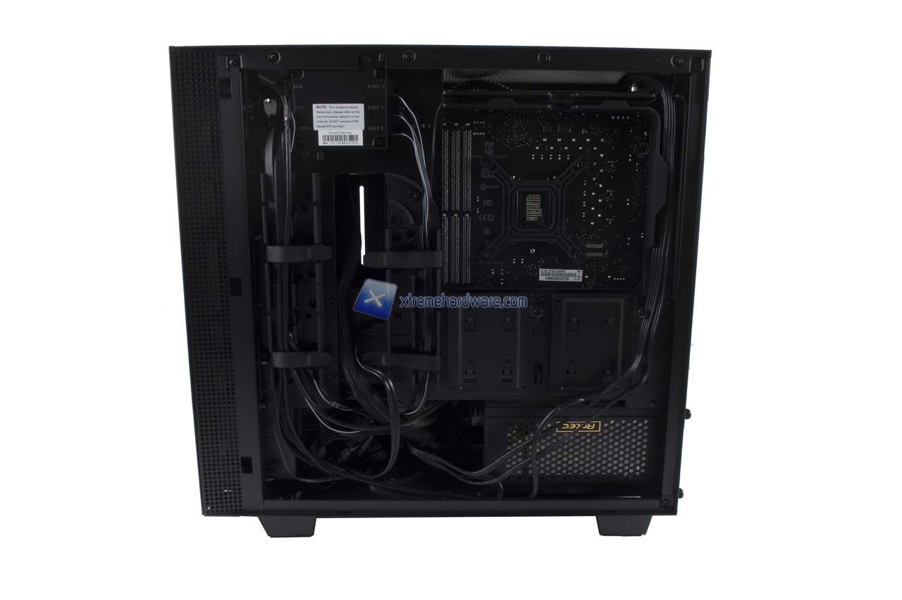 L’installazione nell’NXT H400i ha richiesto relativamente poco più di tempo di una soluzione Middle Tower ATX grazie comunque al buon spazio di manovra e i fori realizzati appositamente per organizzare in modo accurato il cablaggio. Quello che potrebbe darvi qualche noia in fase di installazione è il supporto in metallo a lato sinistro delle ventole preinstallate. Come detto potrete ovviare momentaneamente a ciò svitando le due viti che lo tengono in sede, rimuoverlo, installare i vostri componenti e eventualmente rimontarlo. Rimontarlo perché tale supporto fungerà come sorta di copri cavi PSU rendendo l’aspetto interno della vostra Build molto più pulita e ordinata.