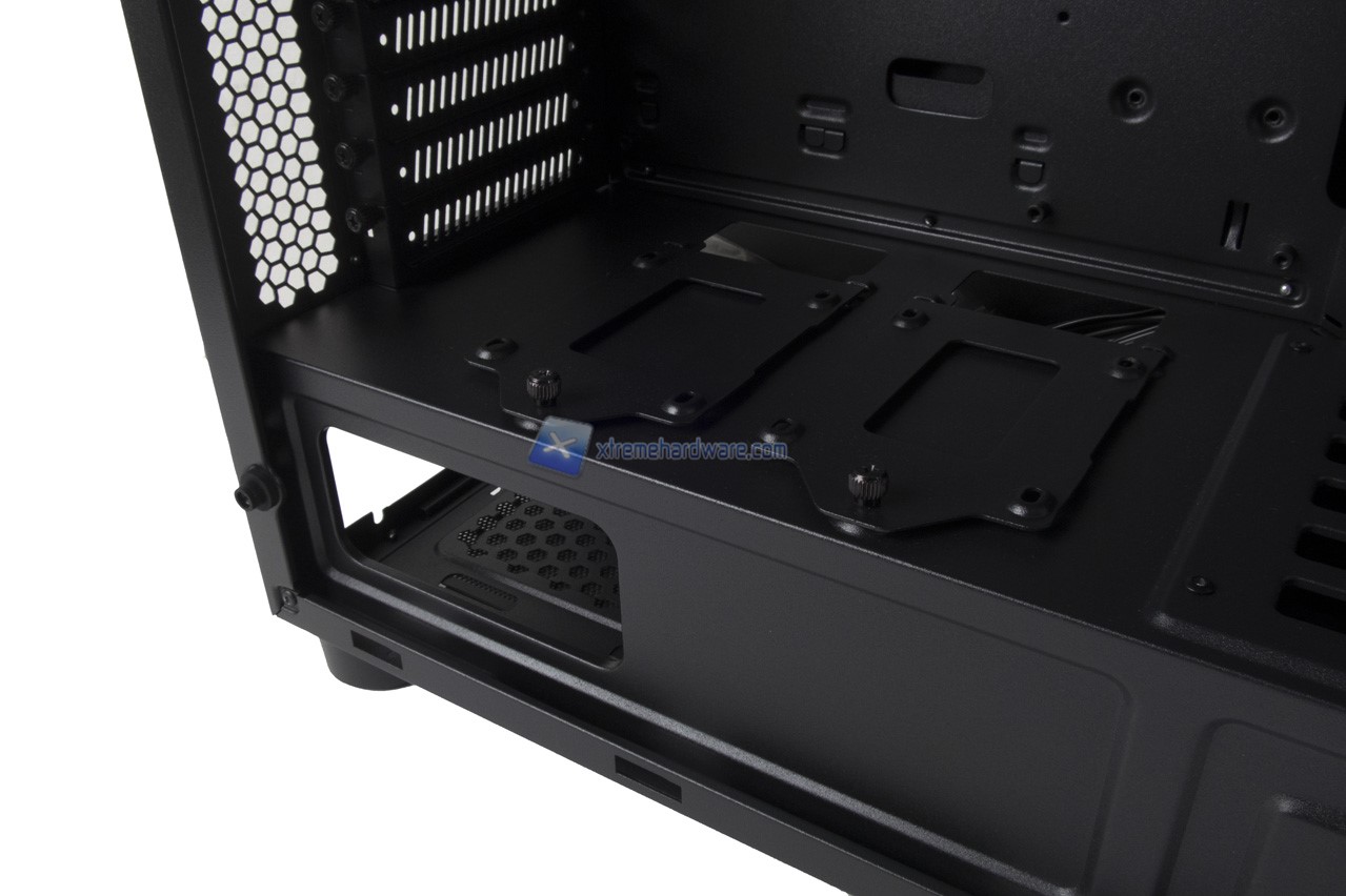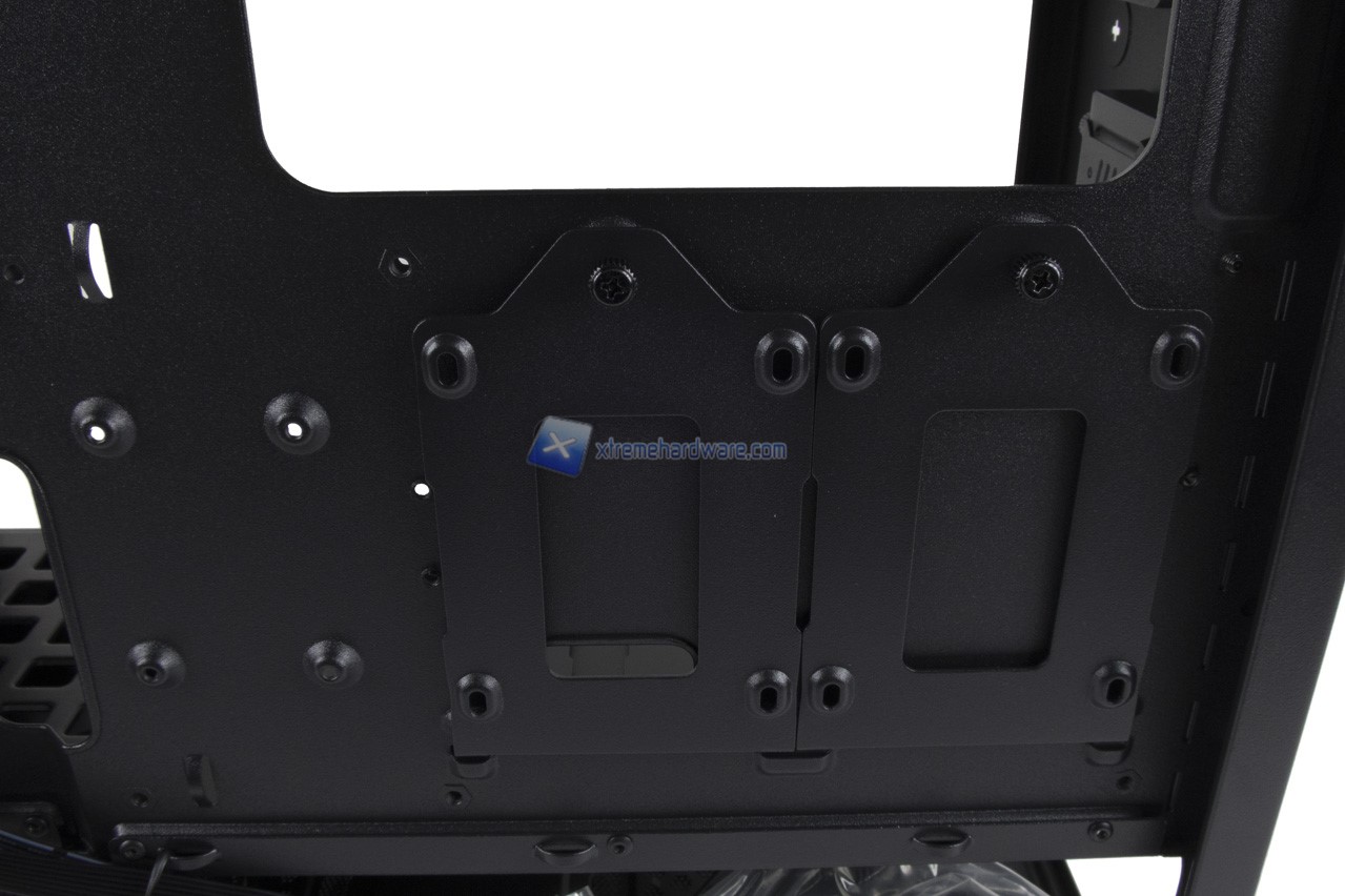 Giriamo il case e diamo uno sguardo al lato posteriore. Ampio foro come dicevamo per installare il backplate del dissipatore, numerosi fori intorno il tray della scheda madre oltre alle due ulteriori staffe per poter installare eventuali SSD anche nel lato posteriore.