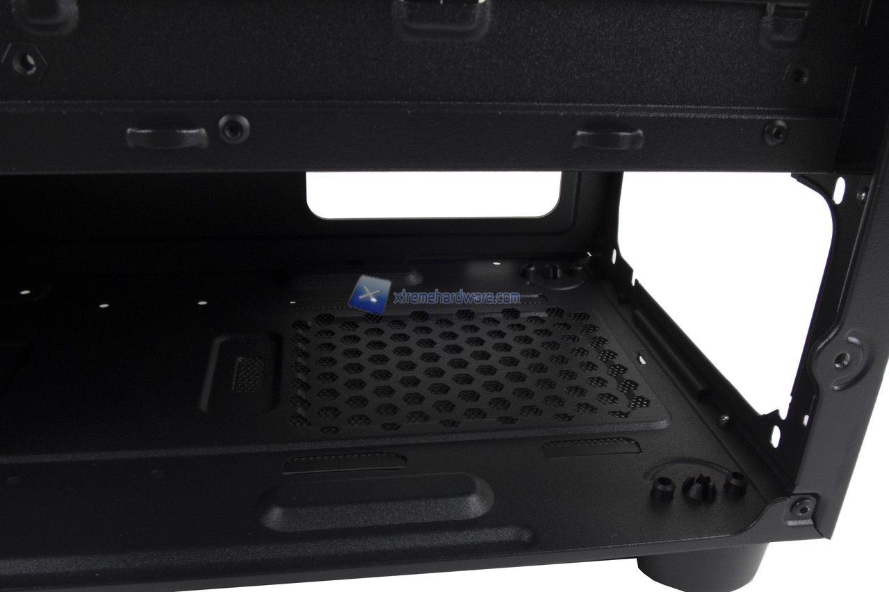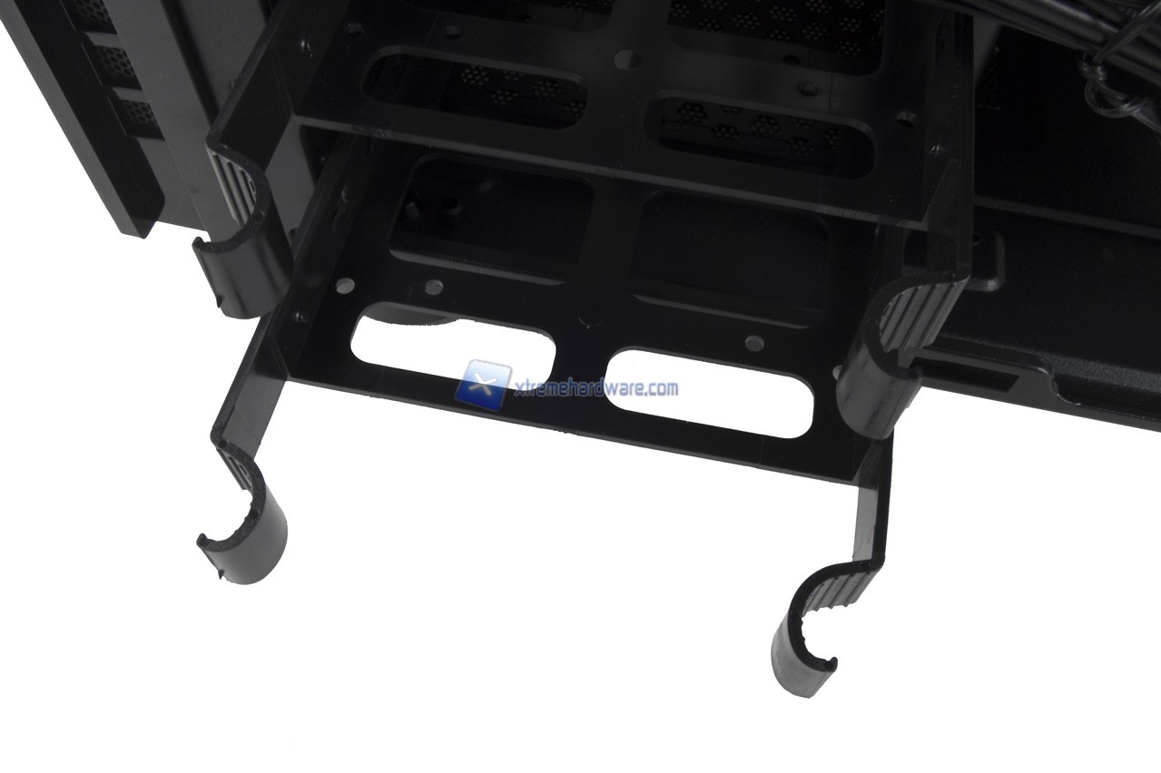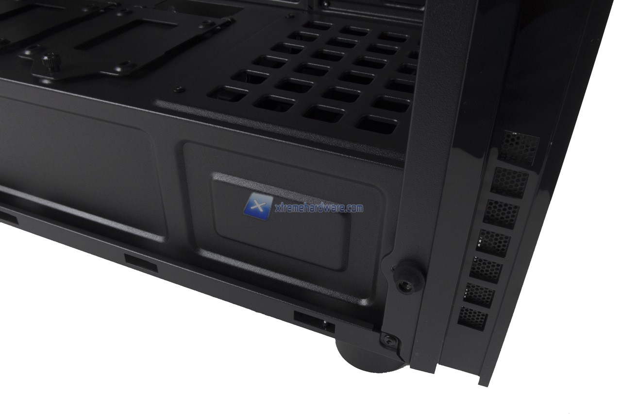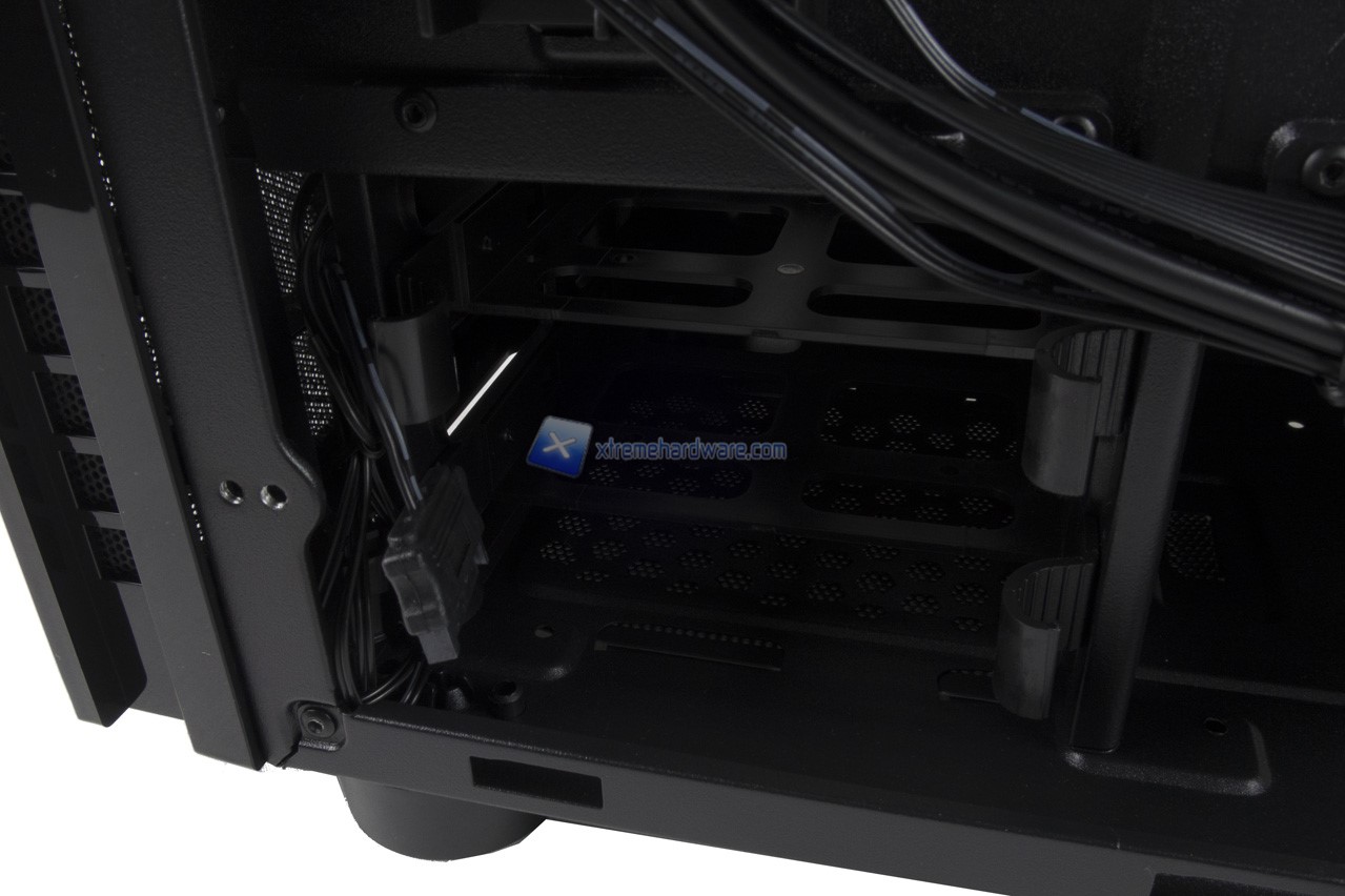 Nel lato inferiore invece il dettaglio del Cage per Hard Disk Meccanici. Unico appunto da fare è che Riotoro ha fornito i fori solo e davvero per Hard Disk da 3,5’’ rendendo impossibile l’installazione di SSD a meno di non utilizzare cavi piatti per l’alimentazione SATA e dati.