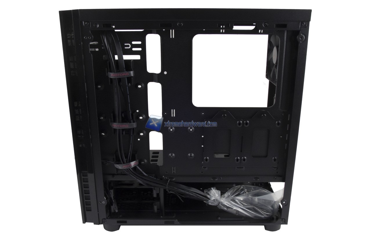 Andando a rimuovere ambo i pannelli laterali possiamo accedere all’interno del case. Il Riotoro CR500 offre ad una prima occhiata un buon spazio di installazione e cablaggio. Il tray della scheda madre presenta un foro largo tramite il quale potremo installare velocemente e successivamente il backplate del dissipatore. Corredato da fori per il passaggio dei cavi verso la scheda madre.