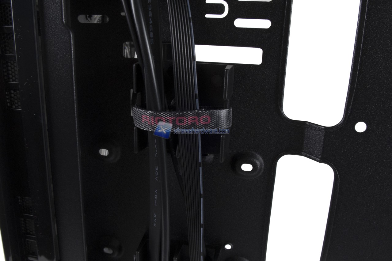 Il Riotoro CR500 presenta anche un Midplate che andrà a coprire e nascondere i cavi del PSU ma mostrerà parte di quest’ultimo grazie ad un ampio foro. Nella parte superiore del Midplate troviamo anche fori per le porte inferiori della scheda madre e due supporti per SSD Tool-Less.